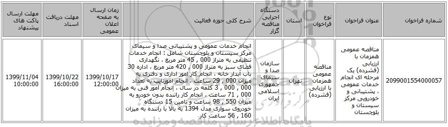 | 2099001554000057 | مناقصه عمومی همزمان با ارزیابی (فشرده) یک مرحله ای انجام خدمات عمومی ، پشتیبانی و خودرویی مرکز سیستان و بلوچستان | مناقصه عمومی همزمان با ارزیابی (فشرده) | تهران | سازمان صدا و سیمای جمهوری اسلامی ایران | انجام خدمات عمومی و پشتیبانی صدا و سیمای مرکز سیستان و بلوچستان شامل : انجام خدمات تنظیفی به متراژ 000 , 45 متر مربع ، نگهداری فضای سبز به متراژ 000 , 420 متر مربع ، اداره 30 باب آبدار خانه ، انجام کار امور اداری و دفتری به میزان 000 , 29 ساعت ، انجام امورتایپ به تعداد 000 , 000 , 3 کلمه در سال ، انجام امور فنی به میزان 000 , 71 ساعت ، انجام کار راننده بدون خودرو به میزان 550 , 98 ساعت و تامین 15 دستگاه خودروی سواری مدل 1394 به بالا با راننده به میزان 160 , 56 ساعت کار | 1399/10/17 12:00:00 | 1399/10/22 16:00:00 | 1399/11/04 10:00:00 |