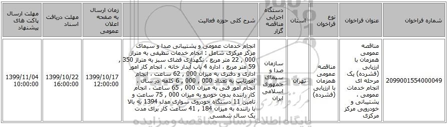| 2099001554000049 | مناقصه عمومی همزمان با ارزیابی (فشرده) یک مرحله ای انجام خدمات عمومی ، پشتیبانی و خودرویی مرکز مرکزی | مناقصه عمومی همزمان با ارزیابی (فشرده) | تهران | سازمان صدا و سیمای جمهوری اسلامی ایران | انجام خدمات عمومی و پشتیبانی صدا و سیمای مرکز مرکزی شامل : انجام خدمات تنظیفی به متراژ 000 , 22 متر مربع ، نگهداری فضای سبز به متراژ 350 , 59 متر مربع ، اداره 4 باب آبدار خانه ، انجام کار امور اداری و دفتری به میزان 000 , 62 ساعت ، انجام امورتایپ به تعداد 000 , 000 , 6 کلمه در سال ، انجام امور فنی به میزان 000 , 65 ساعت ، انجام کار راننده بدون خودرو به میزان 000 , 75 ساعت و تامین 11 دستگاه خودروی سواری مدل 1394 به بالا با راننده به میزان 184 , 41 ساعت کار برای مدت یک سال شمسی | 1399/10/17 12:00:00 | 1399/10/22 16:00:00 | 1399/11/04 10:00:00 |