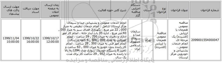 | 2099001554000047 | مناقصه عمومی همزمان با ارزیابی (فشرده) یک مرحله ای انجام خدمات عمومی ، پشتیبانی و خودرویی مرکز لرستان | مناقصه عمومی همزمان با ارزیابی (فشرده) | تهران | سازمان صدا و سیمای جمهوری اسلامی ایران | انجام خدمات عمومی و پشتیبانی صدا و سیمای مرکز لرستان شامل : انجام خدمات تنظیفی به متراژ 000 , 22 متر مربع ، نگهداری فضای سبز به متراژ 000 , 40 متر مربع ، اداره 35 باب آبدار خانه ، انجام کار امور اداری و دفتری به میزان 700 , 29 ساعت ، انجام امورتایپ به تعداد 000 , 500 , 4 کلمه در سال ، انجام امور فنی به میزان 500 , 28 ساعت ، انجام کار راننده بدون خودرو به میزان 000 , 63 ساعت و تامین 8 دستگاه خودروی سواری مدل 1394 به بالا با راننده به میزان 952 , 29 ساعت کار برای مدت یک سال | 1399/10/17 12:00:00 | 1399/10/22 16:00:00 | 1399/11/04 10:00:00 |
