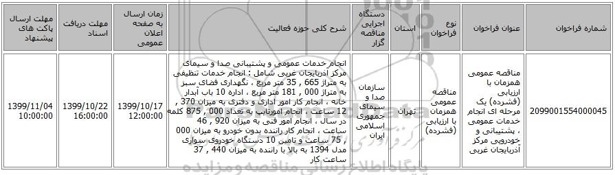 | 2099001554000045 | مناقصه عمومی همزمان با ارزیابی (فشرده) یک مرحله ای انجام خدمات عمومی ، پشتیبانی و خودرویی مرکز آذربایجان غربی | مناقصه عمومی همزمان با ارزیابی (فشرده) | تهران | سازمان صدا و سیمای جمهوری اسلامی ایران | انجام خدمات عمومی و پشتیبانی صدا و سیمای مرکز آذربایجان غربی شامل : انجام خدمات تنظیفی به متراژ 665 , 35 متر مربع ، نگهداری فضای سبز به متراژ 000 , 181 متر مربع ، اداره 10 باب آبدار خانه ، انجام کار امور اداری و دفتری به میزان 370 , 12 ساعت ، انجام امورتایپ به تعداد 000 , 875 کلمه در سال ، انجام امور فنی به میزان 920 , 46 ساعت ، انجام کار راننده بدون خودرو به میزان 000 , 75 ساعت و تامین 10 دستگاه خودروی سواری مدل 1394 به بالا با راننده به میزان 440 , 37 ساعت کار | 1399/10/17 12:00:00 | 1399/10/22 16:00:00 | 1399/11/04 10:00:00 |