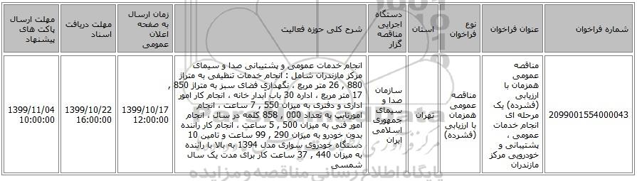 | 2099001554000043 | مناقصه عمومی همزمان با ارزیابی (فشرده) یک مرحله ای انجام خدمات عمومی ، پشتیبانی و خودرویی مرکز مازندران | مناقصه عمومی همزمان با ارزیابی (فشرده) | تهران | سازمان صدا و سیمای جمهوری اسلامی ایران | انجام خدمات عمومی و پشتیبانی صدا و سیمای مرکز مازندران شامل : انجام خدمات تنظیفی به متراژ 880 , 26 متر مربع ، نگهداری فضای سبز به متراژ 850 , 17 متر مربع ، اداره 30 باب آبدار خانه ، انجام کار امور اداری و دفتری به میزان 550 , 7 ساعت ، انجام امورتایپ به تعداد 000 , 858 کلمه در سال ، انجام امور فنی به میزان 500 , 5 ساعت ، انجام کار راننده بدون خودرو به میزان 290 , 99 ساعت و تامین 10 دستگاه خودروی سواری مدل 1394 به بالا با راننده به میزان 440 , 37 ساعت کار برای مدت یک سال شمسی | 1399/10/17 12:00:00 | 1399/10/22 16:00:00 | 1399/11/04 10:00:00 |