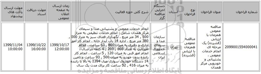 | 2099001554000041 | مناقصه عمومی همزمان با ارزیابی (فشرده) یک مرحله ای انجام خدمات عمومی ، پشتیبانی و خودرویی مرکز همدان | مناقصه عمومی همزمان با ارزیابی (فشرده) | تهران | سازمان صدا و سیمای جمهوری اسلامی ایران | انجام خدمات عمومی و پشتیبانی صدا و سیمای مرکز همدان شامل : انجام خدمات تنظیفی به متراژ 500 , 34 متر مربع ، نگهداری فضای سبز به متراژ 000 , 380 متر مربع ، اداره 14 باب آبدار خانه ، انجام کار امور اداری و دفتری به میزان 800 , 63 ساعت ، انجام امورتایپ به تعداد 000 , 200 , 4 کلمه در سال ، انجام امور فنی به میزان 120 , 5 ساعت ، انجام کار راننده بدون خودرو به میزان 500 , 93 ساعت و تامین 14 دستگاه خودروی سواری مدل 1394 به بالا با راننده به میزان 416 , 52 ساعت کار برای مدت یک سال | 1399/10/17 12:00:00 | 1399/10/22 16:00:00 | 1399/11/04 10:00:00 |