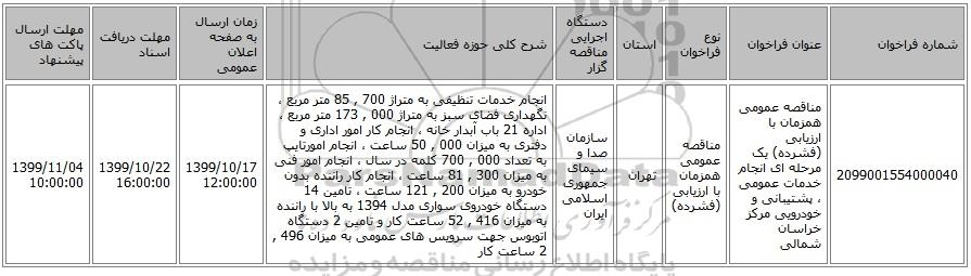 2099001554000040مناقصه عمومی همزمان با ارزیابی (فشرده) یک مرحله ای انجام خدمات عمومی ، پشتیبانی و خودرویی مرکز خراسان شمالیمناقصه عمومی همزمان با ارزیابی (فشرده)تهرانسازمان صدا و سیمای جمهوری اسلامی ایرانانجام خدمات تنظیفی به متراژ 700 , 85 متر مربع ، نگهداری فضای سبز به متراژ 000 , 173 متر مربع ، اداره 21 باب آبدار خانه ، انجام کار امور اداری و دفتری به میزان 000 , 50 ساعت ، انجام امورتایپ به تعداد 000 , 700 کلمه در سال ، انجام امور فنی به میزان 300 , 81 ساعت ، انجام کار راننده بدون خودرو به میزان 200 , 121 ساعت ، تامین 14 دستگاه خودروی سواری مدل 1394 به بالا با راننده به میزان 416 , 52 ساعت کار و تامین 2 دستگاه اتوبوس جهت سرویس های عمومی به میزان 496 , 2 ساعت کار 1399/10/17 12:00:001399/10/22 16:00:001399/11/04 10:00:00