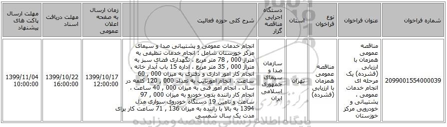 2099001554000039مناقصه عمومی همزمان با ارزیابی (فشرده) یک مرحله ای انجام خدمات عمومی ، پشتیبانی و خودرویی مرکز خوزستانمناقصه عمومی همزمان با ارزیابی (فشرده)تهرانسازمان صدا و سیمای جمهوری اسلامی ایرانانجام خدمات عمومی و پشتیبانی صدا و سیمای مرکز خوزستان شامل : انجام خدمات تنظیفی به متراژ 000 , 78 متر مربع ، نگهداری فضای سبز به متراژ 000 , 35 متر مربع ، اداره 15 باب آبدار خانه ، انجام کار امور اداری و دفتری به میزان 000 , 60 ساعت ، انجام امورتایپ به تعداد 000 , 120 کلمه در سال ، انجام امور فنی به میزان 000 , 40 ساعت ، انجام کار راننده بدون خودرو به میزان 000 , 97 ساعت و تامین 19 دستگاه خودروی سواری مدل 1394 به بالا با راننده به میزان 136 , 71 ساعت کار برای مدت یک سال شمسی1399/10/17 12:00:001399/10/22 16:00:001399/11/04 10:00:00