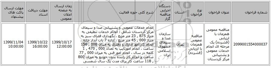 | 2099001554000037 | مناقصه عمومی همزمان با ارزیابی (فشرده) یک مرحله ای انجام خدمات عمومی و پشتیبانی مرکز کردستان | مناقصه عمومی همزمان با ارزیابی (فشرده) | تهران | سازمان صدا و سیمای جمهوری اسلامی ایران | انجام خدمات عمومی و پشتیبانی صدا و سیمای مرکز کردستان شامل : انجام خدمات تنظیفی به متراژ 875 , 23 متر مربع ، نگهداری فضای سبز به متراژ 000 , 45 متر مربع ، اداره 7 باب آبدار خانه ، انجام کار امور اداری و دفتری به میزان 000 , 158 ساعت ، انجام امورتایپ به تعداد 000 , 470 , 1 کلمه در سال ، انجام امور فنی به میزان 000 , 77 ساعت و انجام کار راننده بدون خودرو به میزان 800 , 118 ساعت کار برای مدت یک سال شمسی | 1399/10/17 12:00:00 | 1399/10/22 16:00:00 | 1399/11/04 10:00:00 |