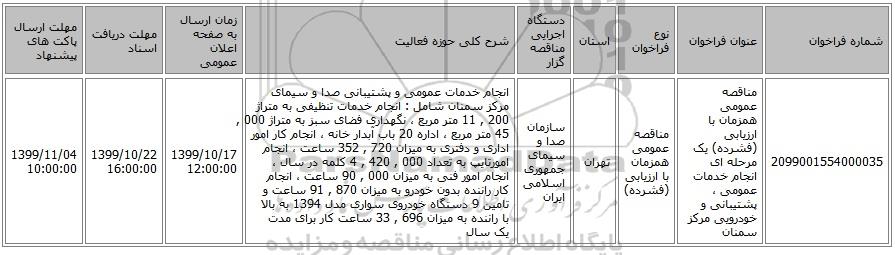 | 2099001554000035 | مناقصه عمومی همزمان با ارزیابی (فشرده) یک مرحله ای انجام خدمات عمومی ، پشتیبانی و خودرویی مرکز سمنان | مناقصه عمومی همزمان با ارزیابی (فشرده) | تهران | سازمان صدا و سیمای جمهوری اسلامی ایران | انجام خدمات عمومی و پشتیبانی صدا و سیمای مرکز سمنان شامل : انجام خدمات تنظیفی به متراژ 200 , 11 متر مربع ، نگهداری فضای سبز به متراژ 000 , 45 متر مربع ، اداره 20 باب آبدار خانه ، انجام کار امور اداری و دفتری به میزان 720 , 352 ساعت ، انجام امورتایپ به تعداد 000 , 420 , 4 کلمه در سال ، انجام امور فنی به میزان 000 , 90 ساعت ، انجام کار راننده بدون خودرو به میزان 870 , 91 ساعت و تامین 9 دستگاه خودروی سواری مدل 1394 به بالا با راننده به میزان 696 , 33 ساعت کار برای مدت یک سال | 1399/10/17 12:00:00 | 1399/10/22 16:00:00 | 1399/11/04 10:00:00 |