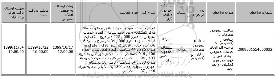 | 2099001554000032 | مناقصه عمومی همزمان با ارزیابی (فشرده) یک مرحله ای انجام خدمات عمومی ، پشتیبانی و خودرویی مرکز کهگیلویه و بویر احمد | مناقصه عمومی همزمان با ارزیابی (فشرده) | تهران | سازمان صدا و سیمای جمهوری اسلامی ایران | انجام خدمات عمومی و پشتیبانی صدا و سیمای مرکز کهگیلویه و بویراحمد شامل : انجام خدمات تنظیفی به متراژ 000 , 222 متر مربع ، نگهداری فضای سبز به متراژ 000 , 34 متر مربع ، اداره 16 باب آبدار خانه ، انجام کار امور اداری و دفتری به میزان 336 , 44 ساعت ، انجام امورتایپ به تعداد 100 , 946 کلمه در سال ، انجام امور فنی به میزان 433 , 94 ساعت ، انجام کار راننده بدون خودرو به میزان 000 , 64 ساعت و تامین 10 دستگاه خودروی سواری مدل 1394 به بالا با راننده به میزان 440 , 37 ساعت کار | 1399/10/17 12:00:00 | 1399/10/22 16:00:00 | 1399/11/04 10:00:00 |