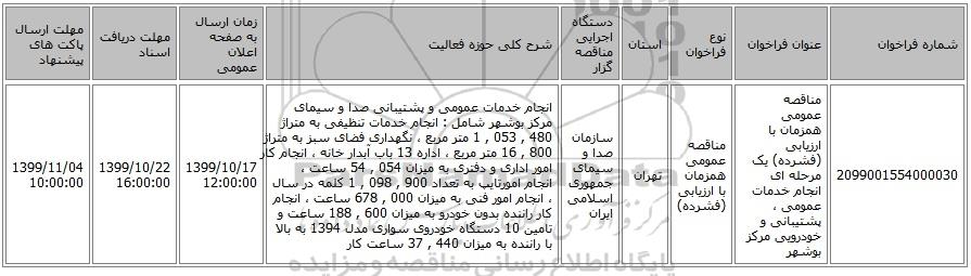| 2099001554000030 | مناقصه عمومی همزمان با ارزیابی (فشرده) یک مرحله ای انجام خدمات عمومی ، پشتیبانی و خودرویی مرکز بوشهر | مناقصه عمومی همزمان با ارزیابی (فشرده) | تهران | سازمان صدا و سیمای جمهوری اسلامی ایران | انجام خدمات عمومی و پشتیبانی صدا و سیمای مرکز بوشهر شامل : انجام خدمات تنظیفی به متراژ 480 , 053 , 1 متر مربع ، نگهداری فضای سبز به متراژ 800 , 16 متر مربع ، اداره 13 باب آبدار خانه ، انجام کار امور اداری و دفتری به میزان 054 , 54 ساعت ، انجام امورتایپ به تعداد 900 , 098 , 1 کلمه در سال ، انجام امور فنی به میزان 000 , 678 ساعت ، انجام کار راننده بدون خودرو به میزان 600 , 188 ساعت و تامین 10 دستگاه خودروی سواری مدل 1394 به بالا با راننده به میزان 440 , 37 ساعت کار | 1399/10/17 12:00:00 | 1399/10/22 16:00:00 | 1399/11/04 10:00:00 |