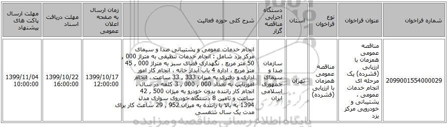 | 2099001554000029 | مناقصه عمومی همزمان با ارزیابی (فشرده) یک مرحله ای انجام خدمات عمومی ، پشتیبانی و خودرویی مرکز یزد | مناقصه عمومی همزمان با ارزیابی (فشرده) | تهران | سازمان صدا و سیمای جمهوری اسلامی ایران | انجام خدمات عمومی و پشتیبانی صدا و سیمای مرکز یزد شامل : انجام خدمات تنظیفی به متراژ 000 , 50 متر مربع ، نگهداری فضای سبز به متراژ 000 , 45 متر مربع ، اداره 4 باب آبدار خانه ، انجام کار امور اداری و دفتری به میزان 333 , 33 ساعت ، انجام امورتایپ به تعداد 000 , 000 , 3 کلمه در سال ، انجام کار راننده بدون خودرو به میزان 500 , 42 ساعت و تامین 8 دستگاه خودروی سواری مدل 1394 به بالا با راننده به میزان 952 , 29 ساعت کار برای مدت یک سال شمسی | 1399/10/17 12:00:00 | 1399/10/22 16:00:00 | 1399/11/04 10:00:00 |