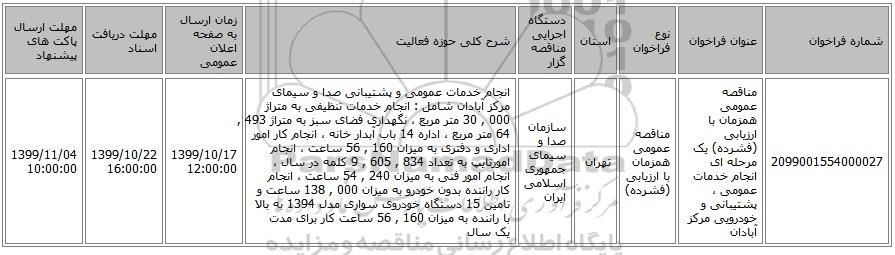 | 2099001554000027 | مناقصه عمومی همزمان با ارزیابی (فشرده) یک مرحله ای انجام خدمات عمومی ، پشتیبانی و خودرویی مرکز آبادان | مناقصه عمومی همزمان با ارزیابی (فشرده) | تهران | سازمان صدا و سیمای جمهوری اسلامی ایران | انجام خدمات عمومی و پشتیبانی صدا و سیمای مرکز آبادان شامل : انجام خدمات تنظیفی به متراژ 000 , 30 متر مربع ، نگهداری فضای سبز به متراژ 493 , 64 متر مربع ، اداره 14 باب آبدار خانه ، انجام کار امور اداری و دفتری به میزان 160 , 56 ساعت ، انجام امورتایپ به تعداد 834 , 605 , 9 کلمه در سال ، انجام امور فنی به میزان 240 , 54 ساعت ، انجام کار راننده بدون خودرو به میزان 000 , 138 ساعت و تامین 15 دستگاه خودروی سواری مدل 1394 به بالا با راننده به میزان 160 , 56 ساعت کار برای مدت یک سال | 1399/10/17 12:00:00 | 1399/10/22 16:00:00 | 1399/11/04 10:00:00 |