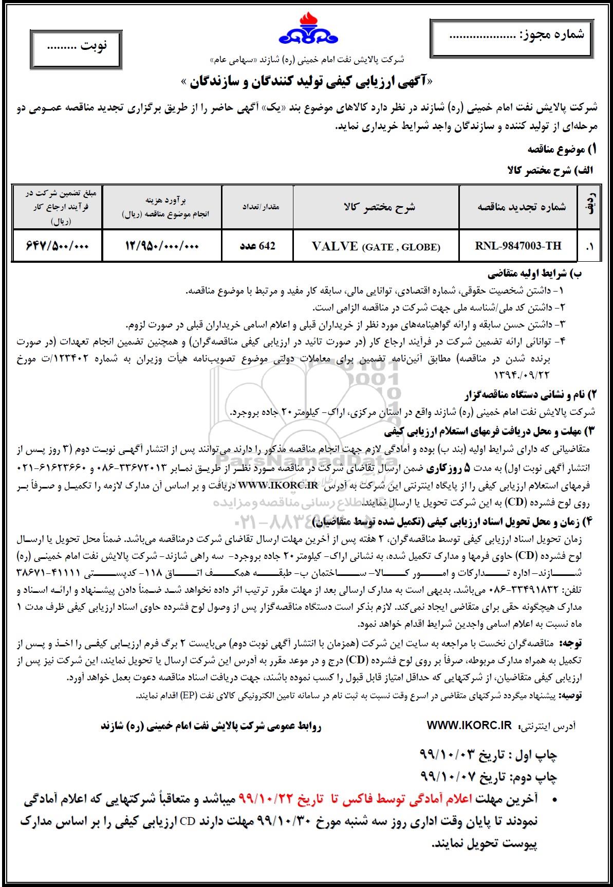 ارزیابی کیفی VALVE GATE. GLOBE از کلیه افراد متخصص و شرکتها واجد شرایط دعوت به عمل میآید در مناقصه با کد خبرگزاری پارس نماد: 3045998 شرکت نمایند.