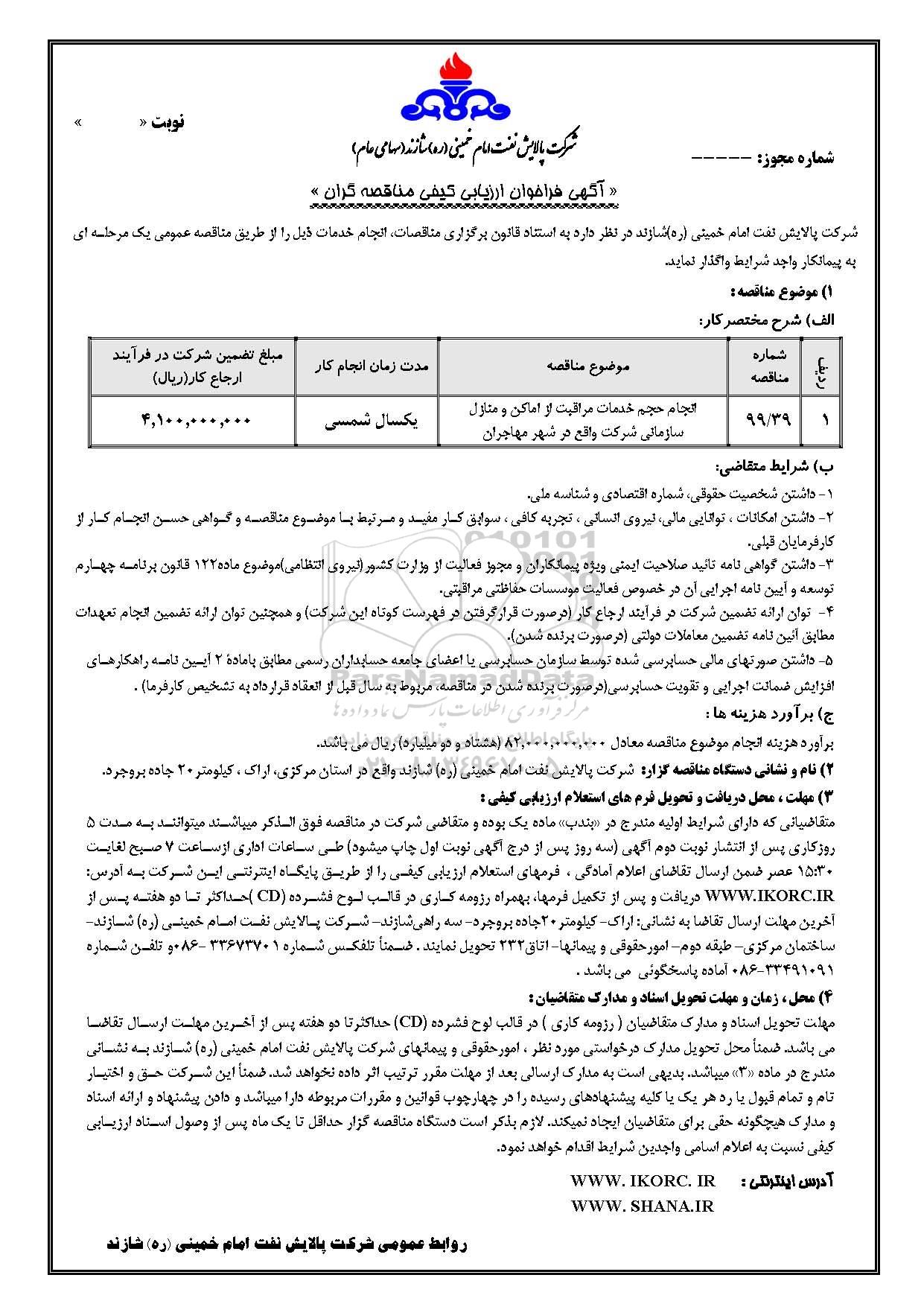 شرکت پالایش نفت امام خمینی (ره) شازند در نظر دارد به استناد قانون برگزاری مناقصات انجام خدمات ذیل را از طریق مناقصه عمومی یک مرحله ای به پیمانکار واجد شرایط واگذار نماید.
