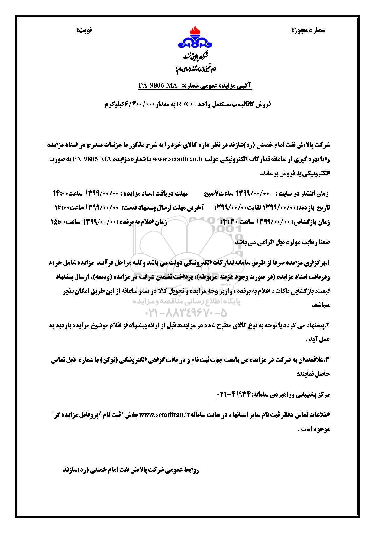 شرکت پالایش نفت امام خمینی ره شازند در نظر دارد کالای خود را به شرح مذکور با جزئیات در اسناد مزایده را با بهره گیری از سامانه تدارکات الکترونیکی دولت سایت ستاد ایران با شماره شماره RA-9806-MA به صورت الکترونیکی به فروش برساند.