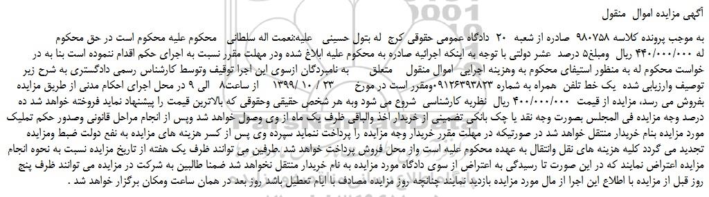 به موجب پرونده کلاسه 980758 صادره از شعبه 20 دادگاه عمومی حقوقی کرج له بتول حسینی علیه:نعمت اله سلطانی محکوم علیه محکوم است در حق محکوم له 440/000/000 ریال ومبلغ5 درصد عشر دولتی با توجه به اینکه اجرائیه صادره به محکوم علیه ابلاغ شده ودر مهلت مقرر نسبت به اجرای حکم اقدام ننموده است بنا به در خواست محکوم له به منظور استیفای محکوم به وهزینه اجرایی اموال منقول متعلق به نامبردگان ازسوی این اجرا توقیف وتوسط کارشناس رسمی دادگستری به شرح زیر توصیف وارزیابی شده یک خط تلفن همراه به شماره 09126393823ومقرر است در مورخ 23 / 10 /1399 از ساعت8 الی 9 در محل اجرای احکام مدنی از طریق مزایده بفروش می رسد، مزایده از قیمت 400/000/000 ریال نظریه کارشناسی شروع می شود وبه هر شخص حقیقی وحقوقی که بالاترین قیمت را پیشنهاد نماید فروخته خواهد شد ده درصد وجه مزایده فی المجلس بصورت وجه نقد یا چک بانکی تضمینی از خریدار اخذ والباقی ظرف یک ماه از وی وصول خواهد شد وپس از انجام مراحل قانونی وصدور حکم تملیک مورد مزایده بنام خریدار منتقل خواهد شد در صورتیکه در مهلت مقرر خریدار وجه مزایده را پرداخت ننماید سپرده وی پس از کسر هزینه های مزایده به نفع دولت ضبط ومزایده تجدید می گردد کلیه هزینه های نقل وانتقال به عهده محکوم علیه است واز محل فروش پرداخت خواهد شد .طرفین می توانند ظرف یک هفته از تاریخ مزایده نسبت به نحوه انجام مزایده اعتراض نمایند که در این صورت تا رسیدگی به اعتراض از سوی دادگاه مورد مزایده به نام خریدار منتقل نخواهد شد ضمنا طالبین به شرکت در مزایده می توانند ظرف پنج روز قبل از مزایده با اطلاع این اجرا از مال مورد مزایده بازدید نمایند چنانچه روز مزایده مصادف با ایام تعطیل باشد روز بعد در همان ساعت ومکان برگزار خواهد شد .