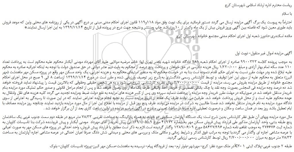 به موجب پرونده کلاسه 9900323 صادره از اجرای احکام شعبه 281 دادگاه خانواده شهید باهنر تهران لها: خانم مرضیه مولایی علیه آقای مهرداد مومنی آبکنار محکوم علیه محکوم است به پرداخت تعداد 110 عدد سکه تمام بهار آزادی و مبلغ 1/220/000 ریال هزینه دادرسی در حق خواهان و پرداخت پنج درصد از محکوم به بابت نیم عشر دولتی در حق صندوق دولت با توجه به اینکه اجرائیه صادره به محکوم علیه ابلاغ شده ودر مهلت مقرر نسبت به اجرای حکم اقدام ننموده است بنا به در خواست محکوم له به منظور استیفای محکوم به و هزینه اجرایی، یک واحد مسکن مهر واقع در پروژه مسکن مهر ماهدشت (مهر البرز) متعلق به محکوم علیه از سوی این اجرا توقیف و توسط کارشناس رسمی دادگستری به شرح زیر توصیف وارزیابی شده و مقرر است در مورخ 1399/11/14 ازساعت 8 الی 9 صبح در محل اجرای احکام مجتمع خانواده از طریق مزایده بفروش می رسد، مزایده از قیمت 2/700/000/000 ریال نظریه کارشناسی شروع می شود و به هر شخص حقیقی وحقوقی که بالاترین قیمت را پیشنهاد نماید فروخته خواهد شد ده درصد وجه مزایده فی المجلس بصورت وجه نقد یا چک بانکی تضمینی از خریدار اخذ والباقی ظرف یک ماه از وی وصول خواهد شد و پس از انجام مراحل قانونی و صدور حکم تملیک مورد مزایده بنام خریدار منتقل خواهد شد در صورتیکه در مهلت مقرر خریدار وجه مزایده را پرداخت ننماید سپرده وی پس از کسر هزینه های مزایده به نفع دولت ضبط ومزایده تجدید می گردد کلیه هزینه های نقل وانتقال به عهده محکوم علیه است و از محل فروش پرداخت خواهد شد. طرفین می توانند ظرف یک هفته از تاریخ مزایده نسبت به نحوه انجام مزایده اعتراض نمایند که در این صورت تا رسیدگی به اعتراض از سوی دادگاه مورد مزایده به نام خریدار منتقل نخواهد شد ضمنا طالبین به شرکت در مزایده می توانند ظرف پنج روز قبل از مزایده با اطلاع این اجرا از مال مورد مزایده بازدید نمایند چنانچه روز مزایده مصادف با ایام تعطیل باشد روز بعد در همان ساعت و مکان و درصورت تعطیلی اداره صرفا در ساعت تعیینی مندرج در آگهی مراسم مزایده در اولین ساعت کاری بعد از آن برگزار خواهد شد .
