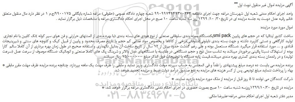 واحد اجرای احکام مدنی شعبه اول شهرستان مراغه جهت اجرای دادنامه 9909974149300363 شعبه چهارم دادگاه عمومی (حقوقی) مراغه شماره بایگانی 9900175/ج.م 1 در نظر دارد مال منقول متعلق خانم رقیه عدل دوست به جلسه مزایده ای در تاریخ30/ 10/ 1399 روز سه شنبه ساعت 10 صبح در محل اجرای احکام دادگستری مراغه با مشخصات ذیل برگزار نماید .