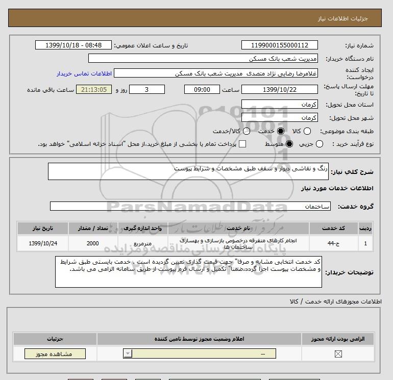 شرح کلی نیاز: رنگ و نقاشی دیوار و سقف طبق مشخصات و شرایط پیوست