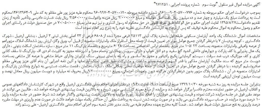 "آگهی مزایده اموال غیر منقول "نوبت سوم شماره پرونده اجرایی : 971251