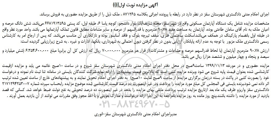 اجرای احکام مدنی دادگستری شهرستان سقز در نظر دارد در رابطه با پرونده اجرائی بکلاسه 871265 ، ملک ذیل را از طریق مزایده حضوری به فروش برساند.