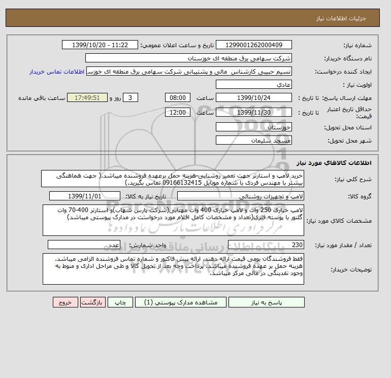مشخصات کالای مورد نیاز: لامپ خیاری 250 وات و لامپ خیاری 400 وات مهتابی(شرکت پارس شهاب)و استارتر 400-70 وات گلنور با پوسته فلزی(تعداد و مشخصات کامل اقلام مورد درخواست در مدارک پیوستی میباشد)