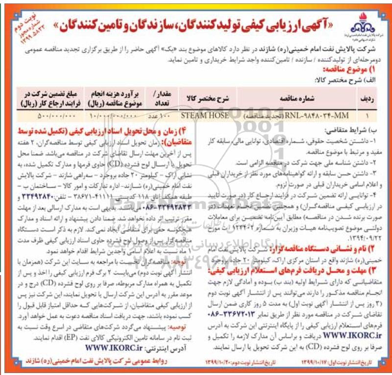 ارزیابی کیفی STEAM HOSE نوبت دوم از کلیه افراد متخصص و شرکتها واجد شرایط دعوت به عمل میآید در مناقصه با کد خبرگزاری پارس نماد: 3053312 شرکت نمایند.