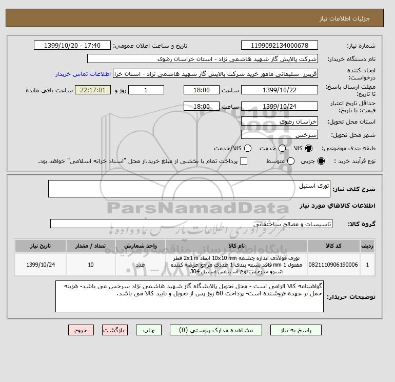 نام دستگاه خریدار:شرکت پالایش گاز شهید هاشمی نژاد - استان خراسان رضوی