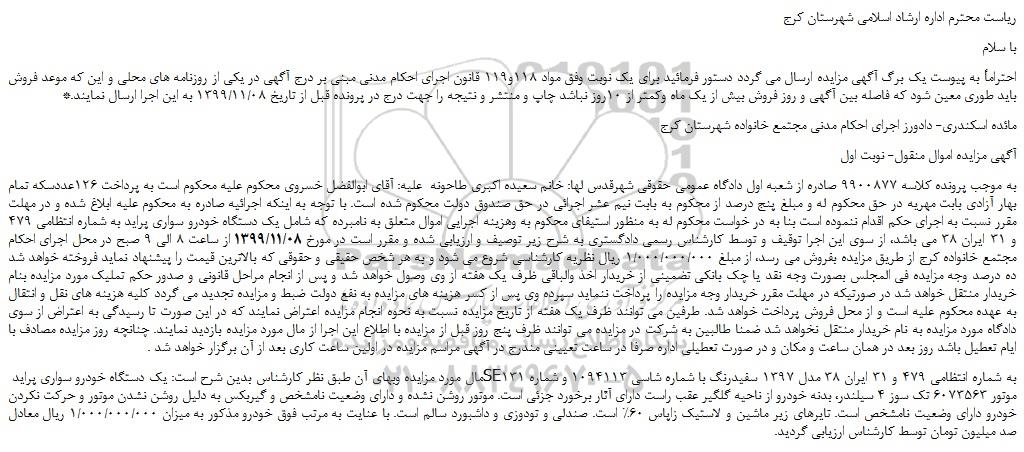 به موجب پرونده کلاسه 9900877 صادره از شعبه اول دادگاه عمومی حقوقی شهرقدس لها: خانم سعیده اکبری طاحونه علیه: آقای ابوالفضل خسروی محکوم علیه محکوم است به پرداخت 126عددسکه تمام بهار آزادی بابت مهریه در حق محکوم له و مبلغ پنج درصد از محکوم به بابت نیم عشر اجرائی در حق صندوق دولت محکوم شده است. با توجه به اینکه اجرائیه صادره به محکوم علیه ابلاغ شده و در مهلت مقرر نسبت به اجرای حکم اقدام ننموده است بنا به در خواست محکوم له به منظور استیفای محکوم به وهزینه اجرایی اموال متعلق به نامبرده که شامل یک دستگاه خودرو سواری پراید به شماره انتظامی 479 و 31 ایران 38 می باشد، از سوی این اجرا توقیف و توسط کارشناس رسمی دادگستری به شرح زیر توصیف و ارزیابی شده و مقرر است در مورخ 1399/11/08 از ساعت 8 الی 9 صبح در محل اجرای احکام مجتمع خانواده کرج از طریق مزایده بفروش می رسد، از مبلغ 1/000/000/000 ریال نظریه کارشناسی شروع می شود و به هر شخص حقیقی و حقوقی که بالاترین قیمت را پیشنهاد نماید فروخته خواهد شد ده درصد وجه مزایده فی المجلس بصورت وجه نقد یا چک بانکی تضمینی از خریدار اخذ والباقی ظرف یک هفته از وی وصول خواهد شد و پس از انجام مراحل قانونی و صدور حکم تملیک مورد مزایده بنام خریدار منتقل خواهد شد در صورتیکه در مهلت مقرر خریدار وجه مزایده را پرداخت ننماید سپرده وی پس از کسر هزینه های مزایده به نفع دولت ضبط و مزایده تجدید می گردد کلیه هزینه های نقل و انتقال به عهده محکوم علیه است و از محل فروش پرداخت خواهد شد. طرفین می توانند ظرف یک هفته از تاریخ مزایده نسبت به نحوه انجام مزایده اعتراض نمایند که در این صورت تا رسیدگی به اعتراض از سوی دادگاه مورد مزایده به نام خریدار منتقل نخواهد شد ضمنا طالبین به شرکت در مزایده می توانند ظرف پنج روز قبل از مزایده با اطلاع این اجرا از مال مورد مزایده بازدید نمایند. چنانچه روز مزایده مصادف با ایام تعطیل باشد روز بعد در همان ساعت و مکان و در صورت تعطیلی اداره صرفا در ساعت تعیینی مندرج در آگهی مراسم مزایده در اولین ساعت کاری بعد از آن برگزار خواهد شد .