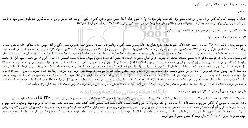 به موجب پرونده کلاسه 9900882 صادره از شعبه 258 دادگاه خانواده شهید مفتح تهران لها: خانم نسرین مقیم بگلی با وکالت خانم خدیجه نریمانی علیه خانم ثریا مقیم بیگی و آقای موسی اسدی محکوم علیه محکوم است به پرداخت 12 عددسکه تمام بهارآزادی و مبلغ 810/870/144 ریال بابت مهریه و مبلغ 1/370/000 تومان بابت خسارات دادرسی و حق الوکاله وکیل و مبلغ 3/000/000 ریال هزینه کارشناسی در حق محکوم له و باقیمانده خسارات دادرسی به میزان 1/181/000 تومان و همچنین مبلغ 5% از محکوم به بابت نیم عشر دولتی در حق صندوق دولت محکوم شده است با توجه به اینکه اجرائیه صادره به محکوم علیه ابلاغ شده و در مهلت مقرر نسبت به اجرای حکم اقدام ننموده است بنا به در خواست محکوم له به منظور استیفای محکوم به وهزینه اجرایی اموال متعلق به نامبرده که شامل یک دستگاه خودرو سواری سمند به شماره انتظامی 943 ب 36 ایران 66 می باشد، از سوی این اجرا توقیف و توسط کارشناس رسمی دادگستری به شرح زیر توصیف و ارزیابی شده و مقرر است در مورخ 1399/11/12 از ساعت 8 الی 9 صبح در محل اجرای احکام مجتمع خانواده کرج از طریق مزایده بفروش می رسد، ازمبلغ 870/000/000 ریال نظریه کارشناسی شروع می شود و به هر شخص حقیقی و حقوقی که بالاترین قیمت را پیشنهاد نماید فروخته خواهد شد ده درصد وجه مزایده فی المجلس بصورت وجه نقد یا چک بانکی تضمینی از خریدار اخذ والباقی ظرف یک هفته از وی وصول خواهد شد وپس از انجام مراحل قانونی وصدور حکم تملیک مورد مزایده بنام خریدار منتقل خواهد شد در صورتیکه در مهلت مقرر خریدار وجه مزایده را پرداخت ننماید سپرده وی پس از کسر هزینه های مزایده به نفع دولت ضبط ومزایده تجدید می گرددکلیه هزینه های نقل وانتقال به عهده محکوم علیه است واز محل فروش پرداخت خواهد شد .طرفین می توانند ظرف یک هفته از تاریخ مزایده نسبت به نحوه انجام مزایده اعتراض نمایند که در این صورت تا رسیدگی به اعتراض از سوی دادگاه مورد مزایده به نام خریدار منتقل نخواهد شد ضمنا طالبین به شرکت در مزایده می توانند ظرف پنج روز قبل از مزایده با اطلاع این اجرا از مال مورد مزایده بازدید نمایند. چنانچه روز مزایده مصادف با ایام تعطیل باشد روز بعد در همان ساعت و مکان و در صورت تعطیلی اداره صرفا در ساعت تعیینی مندرج در آگهی مراسم مزایده در اولین ساعت کاری بعد از آن برگزار خواهد شد .