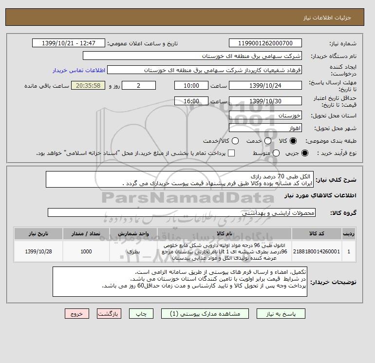 شرح کلی نیاز: الکل طبی 70 درصد رازی