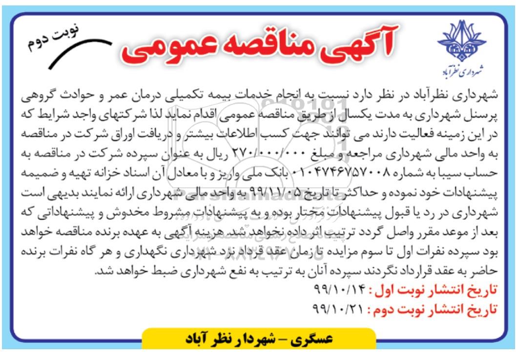 شهرداری نظرآباد در نظر دارد نسبت به انجام خدمات بیمه تکمیلی درمان عمر و حوادث گروهی پرسنل شهرداری به مدت یک سال از طریق مناقصه عمومی اقدام نماید لذا شرکت های  واجد شرایط ه در این زمینه فعالیت دارند می توانند جهت کسب اطلاعات بیشتر و دریافت اوراق شرکت در مناقصه به واحد مالی شهرداری مراجعه و مبلغ 270.000.000 ریال به عنوان سپرده شرکت در مناقصه به حساب سیبا به شماره 0104746757008 بانک ملی واریز و با معادل آن اسناد خزانه تهیه و ضمیمه پیشنهادات خود نموده و حداکثر تا تاریخ 99.11.5 به واحد مالی شهرداری ارائه نمایند بدیهی است شهرداری در رد یا قبول پیشنهادات مختار بوده و به پیشنهادات مشروط مخدوش و پیشنهاداتی که بعد از موعد مقرر واصل گردد ترتیب اثر داده نخواهد شد هزینه آگهی به عهده برنده مناقصه خواهد بود سپرده نفرات اول تا سوم مزایده تا زمان عقد قرارداد نزد شهرداری نگهداری و هر گاه نفرات برند حاضر به عقد قرارداد نگردند سپرده آنان به ترتیب به نفع شهرداری ضبط خواهد شد