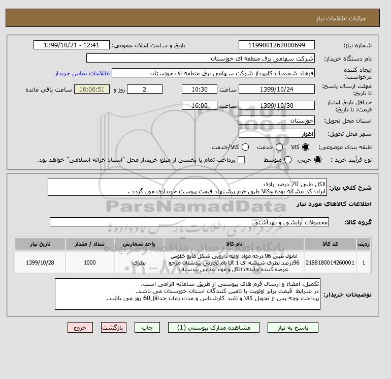 شرح کلی نیاز: الکل طبی 70 درصد رازی