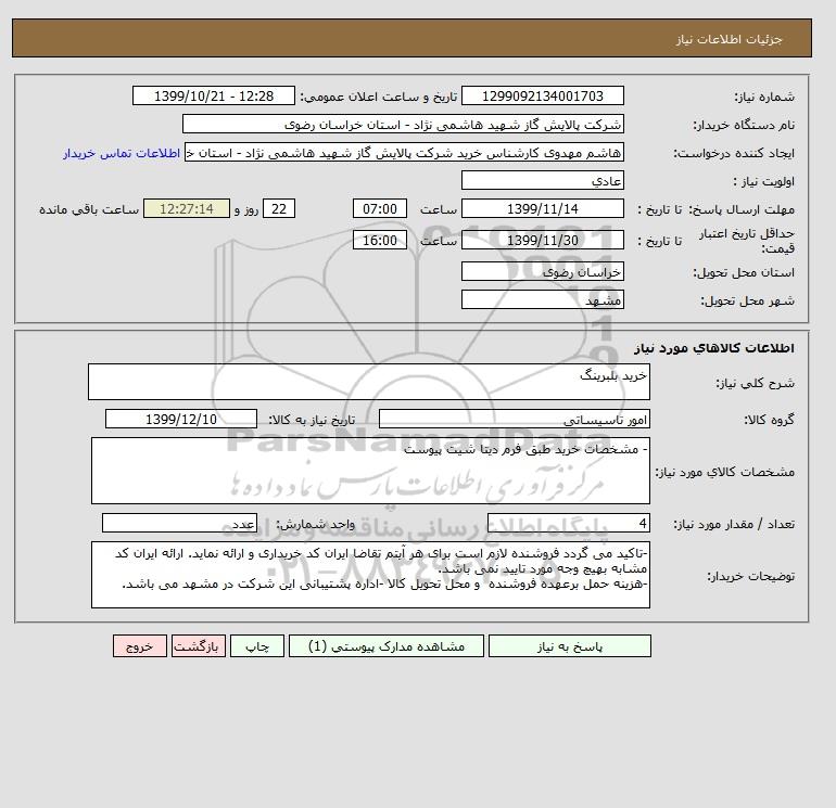 نام دستگاه خریدار:شرکت پالایش گاز شهید هاشمی نژاد - استان خراسان رضوی