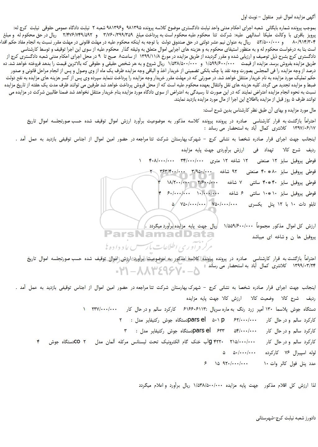 بموجب پرونده شماره بایگانی  شعبه اجرای احکام مدنی واحد نیابت دادگستری موضوع کلاسه پرونده 981395  و981396 شعبه 2  نیابت دادگاه عمومی حقوقی  نیابت  کرج له: پرویز  باقری  با  وکالت  ملیکا  اسدالهی  علیه:  شرکت  تتا  محکوم علیه محکوم است به پرداخت مبلغ  3/760/399/359    و  2/476/749/592    ریال در حق محکوم له  و مبلغ 80/914/304      و 52/500/000    ریال به عنوان نیم عشر دولتی در حق صندوق دولت  با توجه به اینکه محکوم علیه در مهلت قانونی در مهلت مقرر نسبت به انجام مفاد حکم اقدام ننموده است بنا به درخواست محکوم له و به منظور استیفای محکوم به و هزینه های اجرایی اموال متعلق به وثیقه گذار  محکوم علیه از سوی این اجرا توقیف و توسط کارشناسی دادگستری کرج بشرح ذیل توصیف و ارزیابی شده و مقرر گردیده از طریق مزایده در مورخ 1399/11/8  از ساعت8  صبح تا  9 در محل اجرای احکام مدنی شعبه دادگستری کرج از طریق مزایده بفروش برسد. مزایده از قیمت    1/599/600/000  و  1/538/500/000  ریال شروع و به هر شخص حقیقی و حقوقی که بالاترین قیمت را بدهد فروخته خواهد شد. ده درصد از وجه مزایده را فی المجلس بصورت وجه نقد یا چک بانکی تضمینی از خریدار اخذ و الباقی وجه مزایده ظرف یک ماه از وی وصول و پس از انجام مراحل قانونی و صدور حکم تملیک مورد مزایده به نام خریدار منتقل خواهد شد. در صورتی که در مهلت مقرر خریدار وجه مزایده را پرداخت ننماید سپرده وی پس از کسر هزینه های مزایده به نفع دولت ضبط و مزایده تجدید می گردد. کلیه هزینه های نقل وانتقال بعهده محکوم علیه است که از محل فروش پرداخت خواهد شد طرفین می توانند ظرف مدت یک هفته از تاریخ مزایده نسبت به نحوه انجام مزایده اعتراض نمایند که در این صورت تا رسیدگی به اعتراض از سوی دادگاه مورد مزایده بنام خریدار منتقل نخواهد شد ضمنا طالبین شرکت در مزایده می توانند ظرف 5 روز قبل از مزایده بااطلاع این اجرا از مال مورد مزایده بازدید نمایند.
