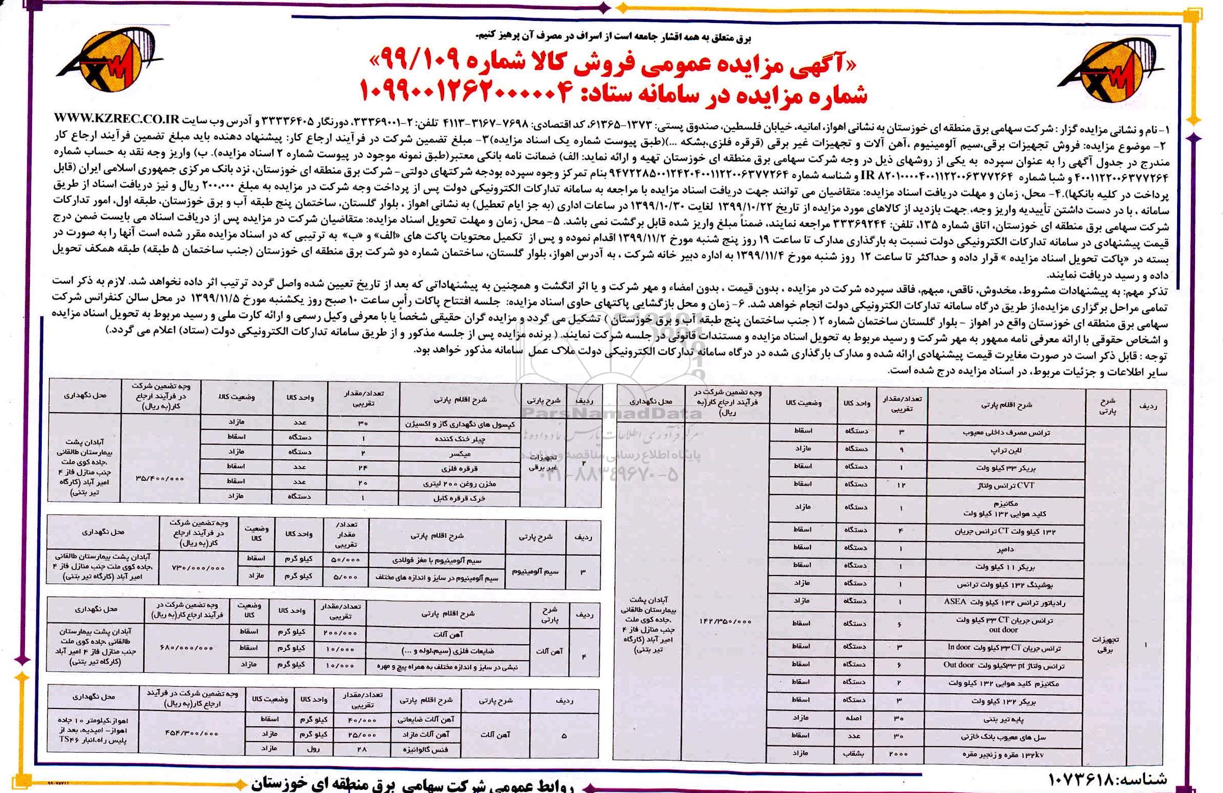 آگهی مزایده عمومی فروش کالا شماره 99.109