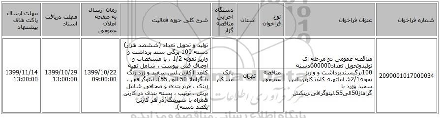 2099001017000034 | مناقصه عمومی دو مرحله ای تولیدوتحویل تعداد600000دسته 100برگیسندبرداشت و واریز نمونه2/1شاملتهیه کاغذکاربن لس سفید وزرد با گراماژ50الی55،لیتوگرافی،زینکش | مناقصه عمومی | تهران | بانک مسکن | تولید و تحویل تعداد (ششصد هزار) دسته 100 برگی سند برداشت و واریز نمونه 1/2 ، با مشخصات و اوصاف فنی پیوست ، شامل تهیه کاغذ (کاربن لس سفید و زرد رنگ با گراماژ 50 الی 55)، لیتوگرافی ، زینک ، فرم بندی و صحافی شامل برش ، ترتیب ، بسته بندی در کارتن همراه با شیرینگ(در هر کارتن یکصد دسته). | 1399/10/22 09:00:00 | 1399/10/29 13:00:00 | 1399/11/14 13:00:00 |