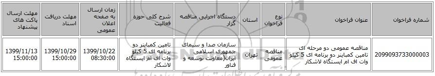 | 2099093733000003 | مناقصه عمومی دو مرحله ای تامین کمباینر دو برنامه ای 5 کیلو وات اف ام ایستگاه لاشکار | مناقصه عمومی | تهران | سازمان صدا و سیمای جمهوری اسلامی ایران(معاونت توسعه و فناور | تامین کمباینر دو برنامه ای 5 کیلو وات اف ام ایستگاه لاشکار | 1399/10/22 08:30:00 | 1399/10/29 15:00:00 | 1399/11/13 15:00:00 |