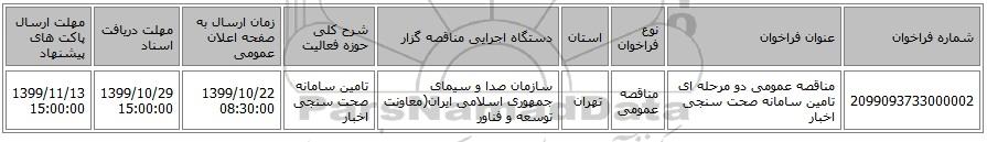 2099093733000002مناقصه عمومی دو مرحله ای تامین سامانه صحت سنجی اخبارمناقصه عمومیتهران سازمان صدا و سیمای جمهوری اسلامی ایران(معاونت توسعه و فناورتامین سامانه صحت سنجی اخبار1399/10/22 08:30:001399/10/29 15:00:001399/11/13 15:00:00