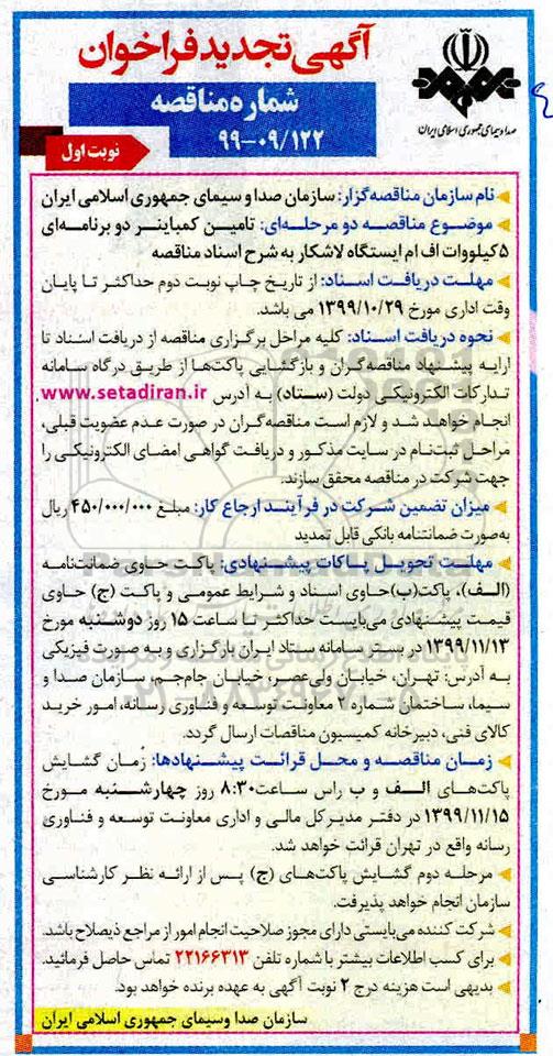 تجدید مناقصه تامین کمباینر دو برنامه ای 5 کیلووات اف ام, تجدید فراخوان مناقصه ،تجدید مناقصه تامین کمباینر دو برنامه ای 5 کیلووات اف ام