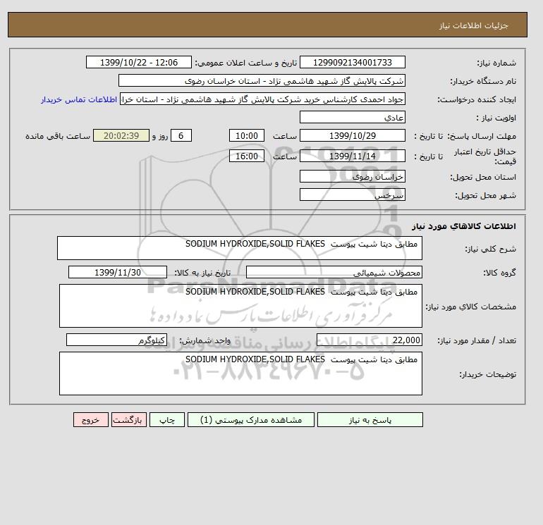 نام دستگاه خریدار:شرکت پالایش گاز شهید هاشمی نژاد - استان خراسان رضوی