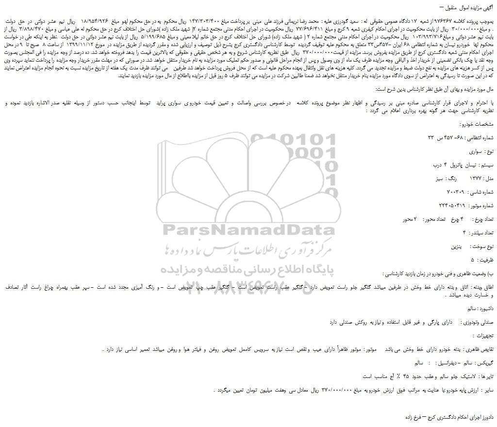 بموجب پرونده کلاسه 976367 از شعبه  17 دادگاه عمومی حقوقی  له :  سعید گودرزی علیه :  محمد رضا نریمانی فرزند علی  مبنی  بر پرداخت مبلغ 147/303/400  ریال محکوم  به در حق محکوم لهو  مبلغ  18/954/926    ریال  نیم  عشر  دولتی  در  حق  دولت  . و مبلغ30/000/000  ریال از بابت محکومیت در اجرای احکام کیفری شعبه 9 کرج و مبلغ 77/696/411  ریال محکومیت در اجرای احکام مدنی مجتمع شماره 2( شهید ملک زاده )شورای حل اختلاف کرج در حق محکوم له علی عباسی و مبلغ 3/898/470  ریال از بابت نیم عشر دولتی و مبلغ103/993/716  ریال محکومیت در اجرای احکام مدنی مجتمع شماره 2 ( شهید ملک زاده) شورای حل اختلاف کرج در حق خانم لیلا معینی و مبلغ 5/199/685  ریال از بابت نیم عشر دولتی در حق دولت  .نظر به اینکه طی در خواست محکوم لها  خوردرو نیسان به شماره انتظامی 68 ایران -457س33 متعلق به محکوم علیه توقیف گردیده  توسط کارشناسی دادگستری کرج بشرح ذیل توصیف و ارزیابی شده و مقرر گردیده از طریق مزایده در  مورخ 1399/11/12  از ساعت 8  صبح تا  9 در محل اجرای احکام مدنی شعبه دادگستری کرج از طریق مزایده بفروش برسد. مزایده از قیمت370/000/000  ریال  طبق نظریه کارشناس شروع و به هر شخص حقیقی و حقوقی که بالاترین قیمت را بدهد فروخته خواهد شد. ده درصد از وجه مزایده را فی المجلس بصورت وجه نقد یا چک بانکی تضمینی از خریدار اخذ و الباقی وجه مزایده ظرف یک ماه از وی وصول و پس از انجام مراحل قانونی و صدور حکم تملیک مورد مزایده به نام خریدار منتقل خواهد شد. در صورتی که در مهلت مقرر خریدار وجه مزایده را پرداخت ننماید سپرده وی پس از کسر هزینه های مزایده به نفع دولت ضبط و مزایده تجدید می گردد. کلیه هزینه های نقل وانتقال بعهده محکوم علیه است که از محل فروش پرداخت خواهد شد طرفین    می توانند ظرف مدت یک هفته از تاریخ مزایده نسبت به نحوه انجام مزایده اعتراض نمایند که در این صورت تا رسیدگی به اعتراض از سوی دادگاه مورد مزایده بنام خریدار منتقل نخواهد شد ضمنا طالبین شرکت در مزایده می توانند ظرف 5 روز قبل از مزایده بااطلاع از مال مورد مزایده بازدید نمایند.