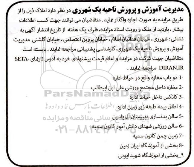 مدیریت آموزش و پرورش ناحیه یک شهر ری در نظر دارد املاک ذیل را از طریق مزایده به صورت اجاره واگذار نماید. متقاضیان می توانند جهت کسب اطلاعات بیشتر بازدید از ملک و رویت اسناد مزایده یک هفته از تاریخ انتشار آگهی به نشانی شهرری خیابان فداییان اسلام خیابان پروین اعتصامی خیابان گلشنی مدیریت آموزش و پرورش ناحیه یک شهرری کارشناسی پشتیبانی مراجعه نمایند بایسته است متقاضیان جهت شرکت در مزایده و اعلام قیمت پیشنهادی خود به ادرس تارنمای ستاد ایران مراجعه نمایند