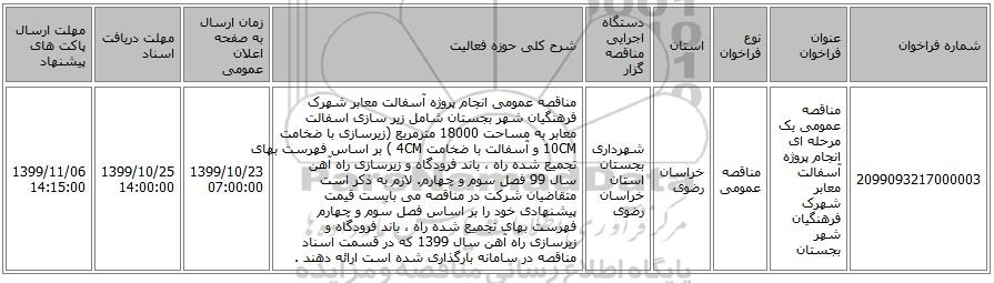 | 2099093217000003 | مناقصه عمومی یک مرحله ای انجام پروژه آسفالت معابر شهرک فرهنگیان شهر بجستان | مناقصه عمومی | خراسان رضوی | شهرداری بجستان استان خراسان رضوی | مناقصه عمومی انجام پروژه آسفالت معابر شهرک فرهنگیان شهر بجستان شامل زیر سازی اسفالت معابر به مساحت 18000 مترمربع (زیرسازی با ضخامت 10CM و آسفالت با ضخامت 4CM ) بر اساس فهرست بهای تجمیع شده راه ، باند فرودگاه و زیرسازی راه آهن سال 99 فصل سوم و چهارم. لازم به ذکر است متقاضیان شرکت در مناقصه می بایست قیمت پیشنهادی خود را بر اساس فصل سوم و چهارم فهرست بهای تجمیع شده راه ، باند فرودگاه و زیرسازی راه آهن سال 1399 که در قسمت اسناد مناقصه در سامانه بارگذاری شده است ارائه دهند . | 1399/10/23 07:00:00 | 1399/10/25 14:00:00 | 1399/11/06 14:15:00 |