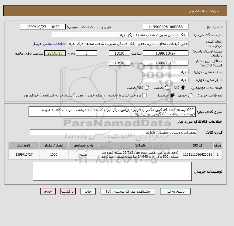 نام دستگاه خریدار: بانک مسکن مدیریت شعب منطقه مرکز تهران
