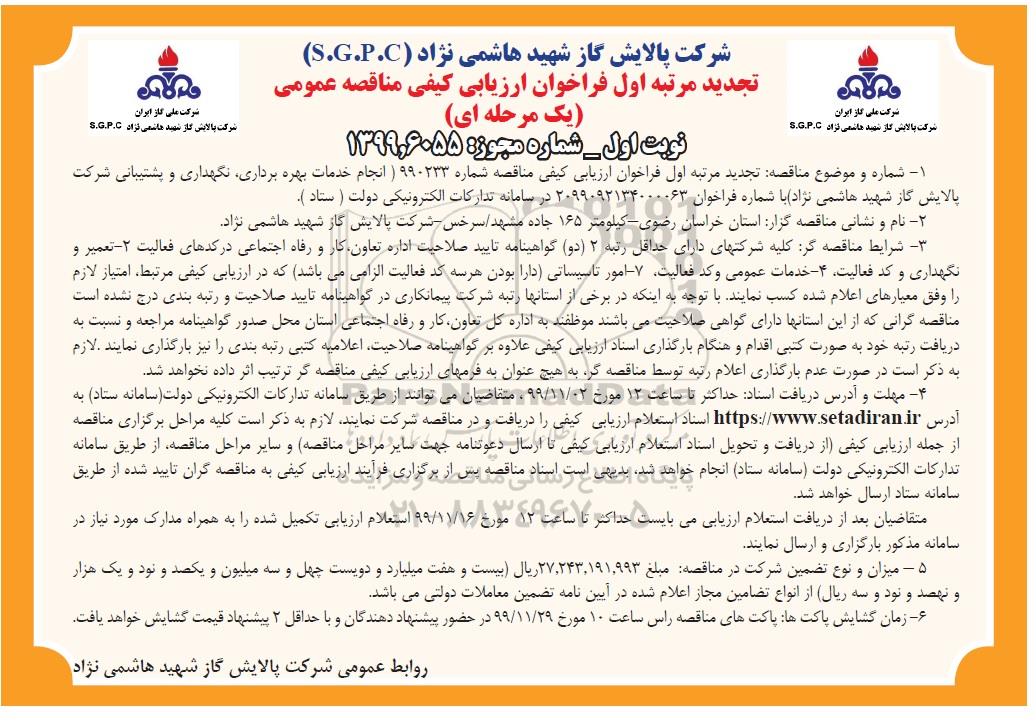 1- شماره و موضوع مناقصه: تجدید مرتبه اول فراخوان ارزیابی کیفی مناقصه شماره 990233 (انجام خدمات بهره برداری، نگهداری و پشتیبانی شرکت پالایش گاز شهید هاشمی نژاد) با شماره فراخوان 2099092134000063 در سامانه تدارکات الکترونیکی دولت (ستاد)
