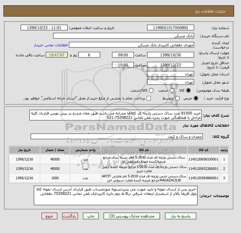 شرح کلی نیاز: خرید 81000 عدد ساک دستی پارچه کد کالاها مشابه می باشد طبق مفاد مندرج در پیش نویس قرارداد کلیه مراحل با هماهنگی صورت پذیرد.تلفن تماس 75358221-021