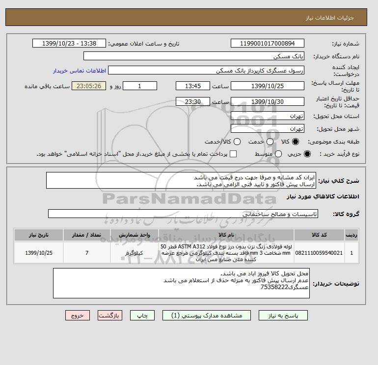 استعلام بها و موضوع استعلام استعلام ایران کد مشابه و صرفا جهت درج قیمت می باشد ارسال پیش فاکتور و تایید فنی الزامی می باشد. به اطلاع کلیه شرکتها و افراد متخصص واجد شرایط میرساند، آگهی گذار در نظر دارد از طریق استعلام بها، نسبت به انتخاب و دریافت پیشنهادات اقدام نماید. این استعلام با کد آگهی ثبت شده در سامانه خبرگزاری پارس نماد : 3066521 منتشر شده است. مشخصات استعلام : تاریخ شروع استعلام: 1399/10/23 آخرین مهلت ارسال پیشنهاد قیمت : 1399/10/24 و محل اجرای پروژه : استان تهران میباشد. استعلام قیمت مورد درخواست : استعلام ایران کد مشابه و صرفا جهت درج قیمت می باشد ارسال پیش فاکتور و تایید فنی الزامی می باشد. با دستهبندیهای تخصصی و گروه های مرتبط : لوله و اتصالات, لوله های فولادی و چدنی, استعلام اطلاع رسانی میگردد. شرایط شرکت در استعلام آنلاین : ابتدا ثبت نام در سامانه استعلام پارس نماد و تکمیل مدارک موردنیاز و بارگذاری در سامانه رعایت تمامی ضوابط و الزامات مندرج در اسناد استعلام است.