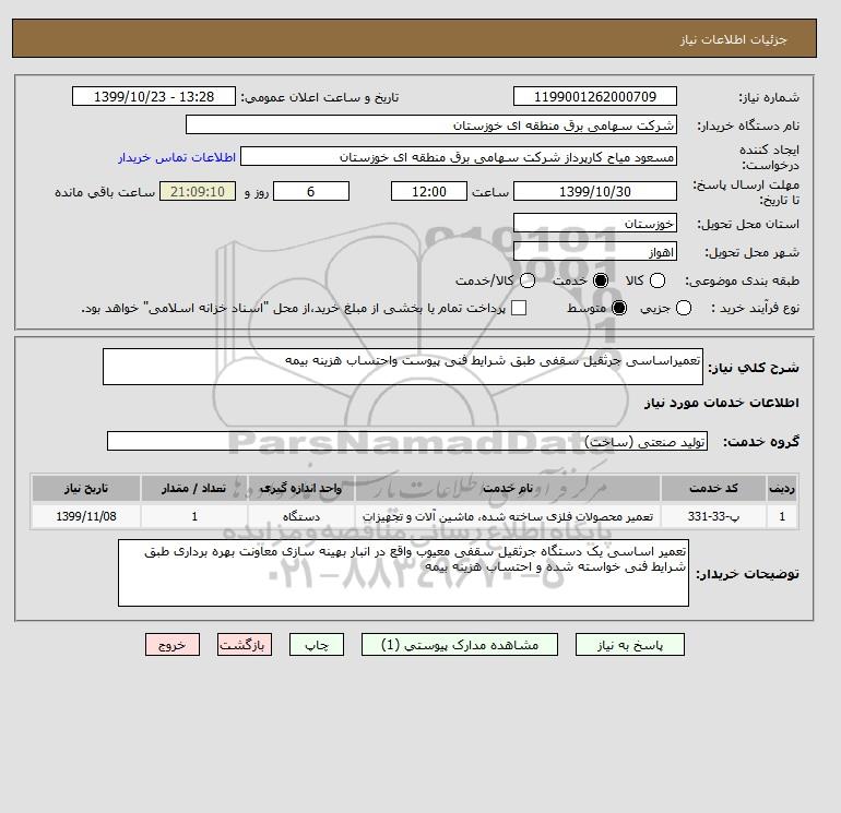 شرح کلی نیاز: تعمیراساسی جرثقیل سقفی طبق شرایط فنی پیوست واحتساب هزینه بیمه