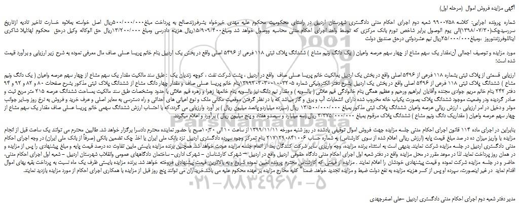 مورد مزایده و توصیف اجمالی آن:مقدار یک سهم مشاع از چهار سهم عرصه واعیان ( یک دانگ ونیم مشاع ) ششدانگ پلاک ثبتی 118 فرعی از 5496 اصلی واقع در بخش یک اردبیل بنام خانم پریسا عسلی صاف مال معرفی نموده به شرح زیر ارزیابی و برآورد قیمت شده است؛