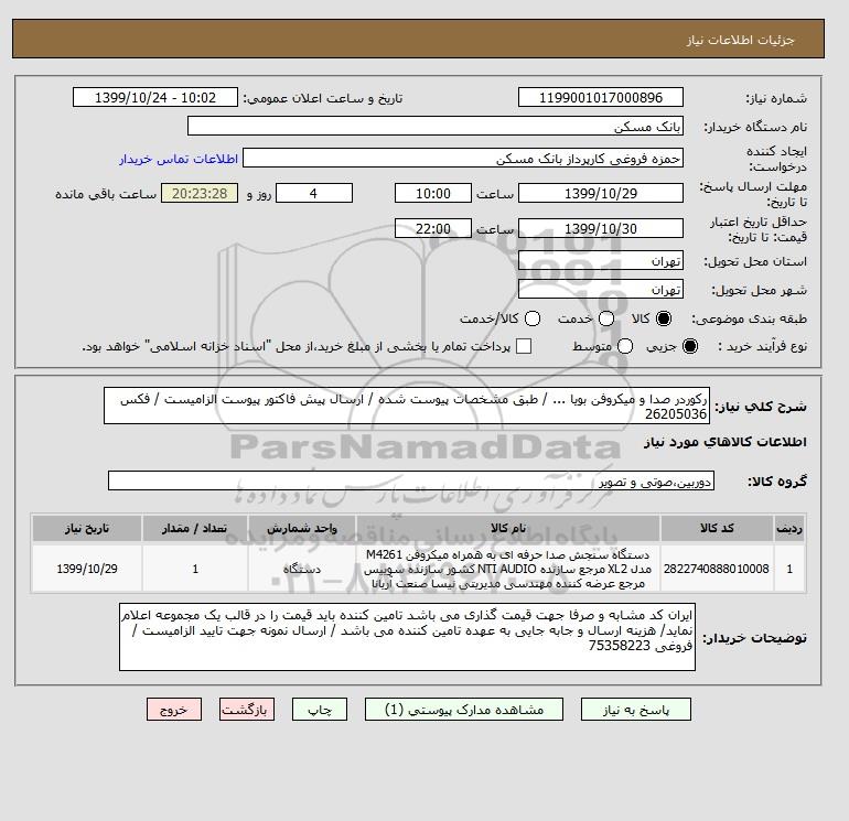 شرح کلی نیاز: رکوردر صدا و میکروفن بویا ... / طبق مشخصات پیوست شده / ارسال پیش فاکتور پیوست الزامیست / فکس 26205036