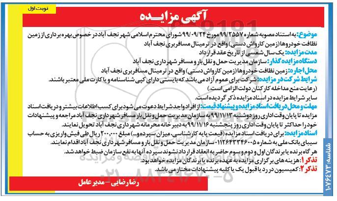 موضوع: در خصوص بهره برداری از زمین نظافت خودروها (زمین کارواش دستی) واقع در ترمینال مسافربری نجف اباد